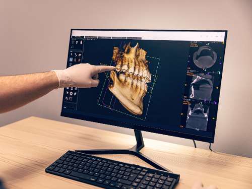 CBCT — A Cone Beam CT (CBCT) scanner provides a 3-D view of the teeth, jawbone, nerves, and surrounding structures.